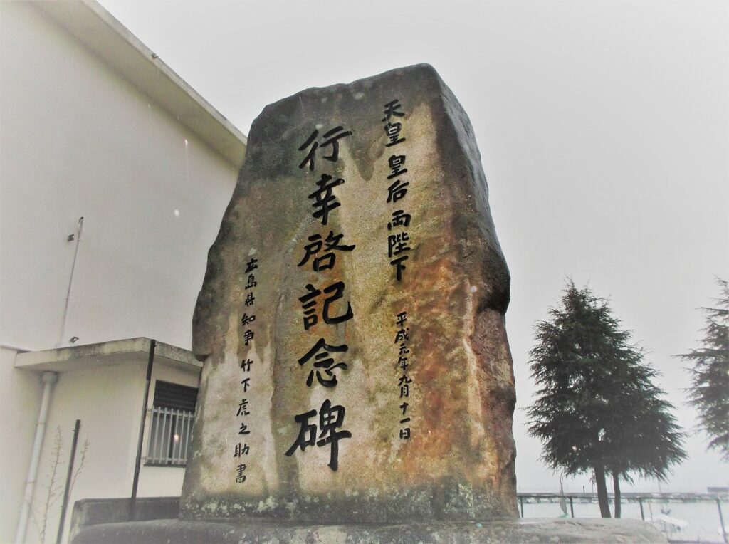 この行幸啓は、明治大正昭和のいずれの天皇でもなく、今上陛下と皇后陛下によるものである。石碑には「平成元年九月十一日」と刻まれているが、両陛下は第9回全国豊かな海づくり大会にご出席のため、前々日の9日に赤坂御所を発たれ広島入りしていた。