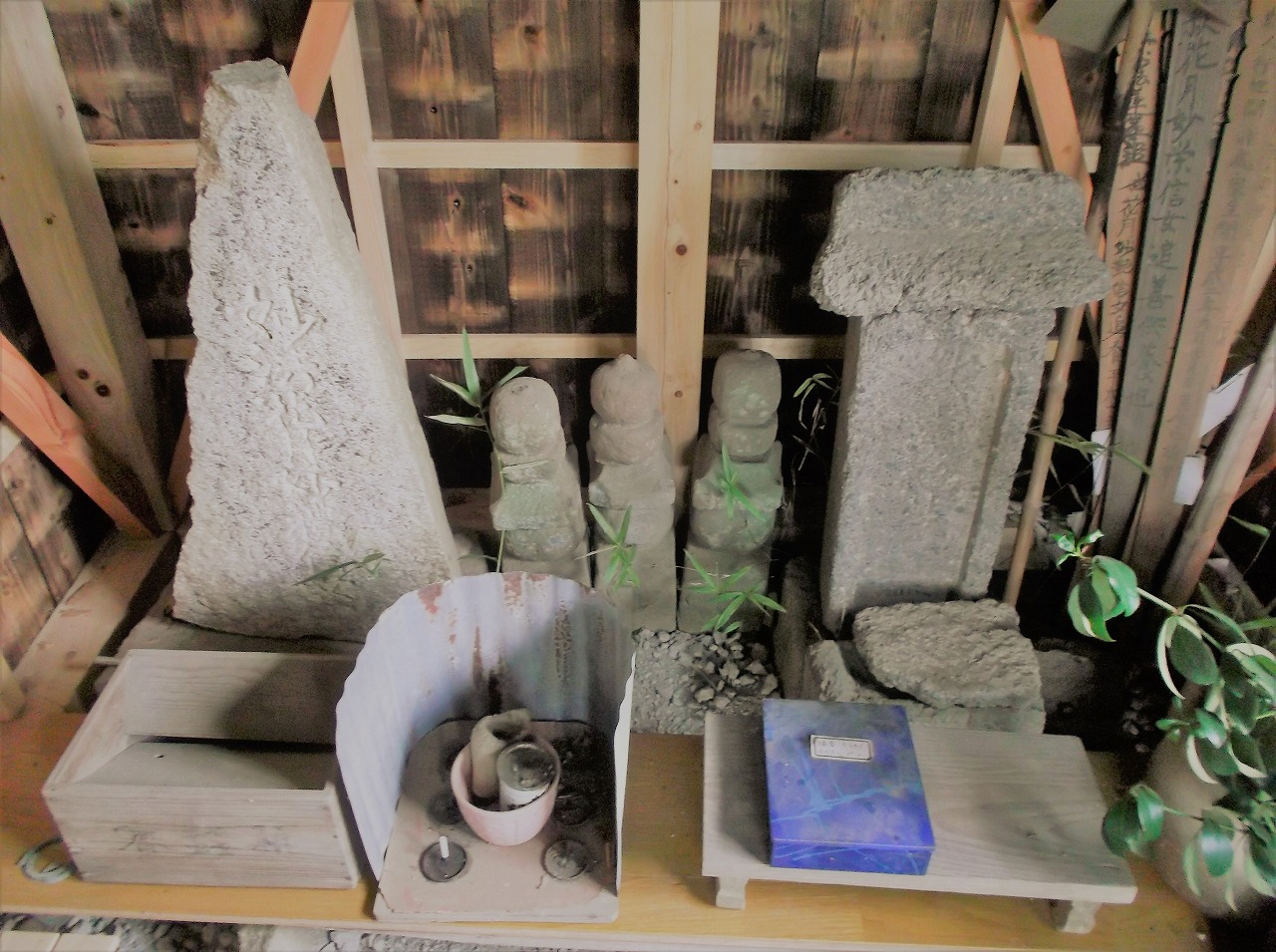 左側の三角形のものがお七の、右側の長方形のものが吉三郎の墓です。
