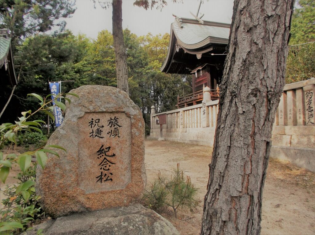 岡山市南区北浦の箱崎八幡宮の境内に「旅順祝捷紀念松」がある。「捷(しょう)」には勝つという意味があるので、旅順攻略をお祝いした記念の松だと分かる。
