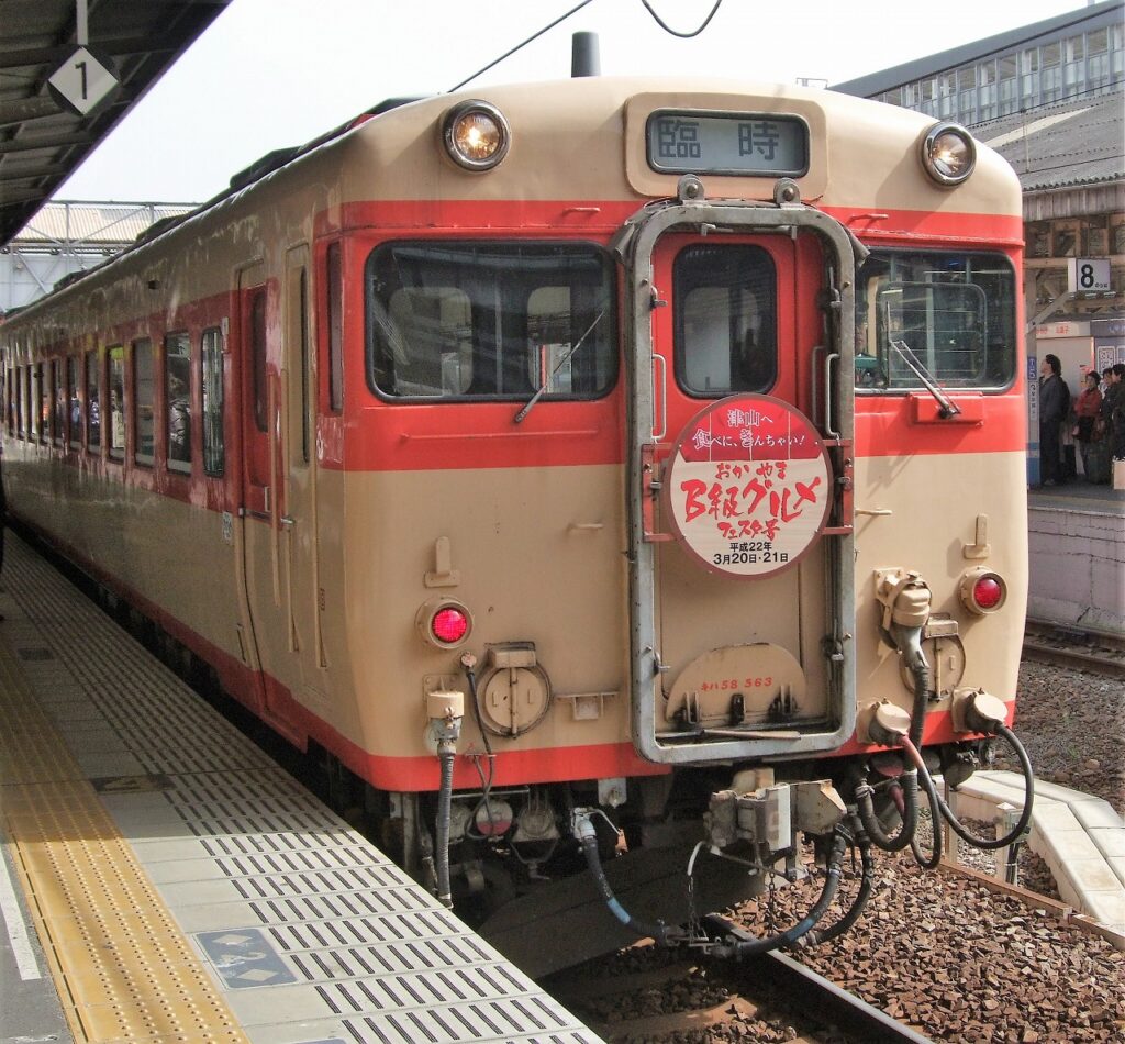 津山市大谷の津山まなびの鉄道館に「キハ58 563」が静態保存されている。写真は3月21日10:00岡山駅発の「おかやまB級グルメフェスタ号」である。「津山へ食べに、きんちゃい!」とあるように津山行きである。