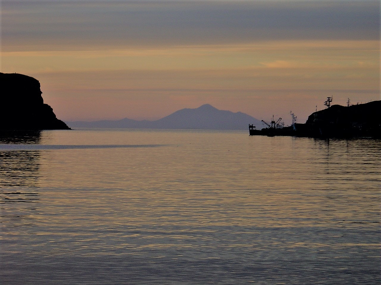 北海道国後(くなしり)郡留夜別(るよべつ)村に「爺爺岳(ちゃちゃだけ)」がある。どっしりとした円錐台の上に小富士が乗る印象的な山容だ。写真は色丹郡色丹(しこたん)村の斜古丹(しゃこたん)港から撮影したシルエットである。