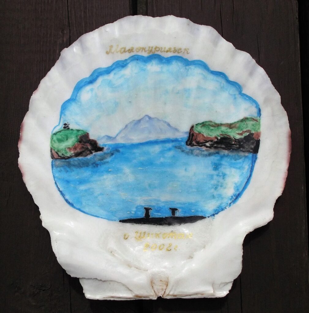 斜古丹の子どもたちがお土産にと、斜古丹港から見た爺爺岳をホタテ貝に描いてくれた。美しいと感じる気持ちは民族に関係ない。ずっと昔にはアイヌの人々が、この山に特別な思いを抱いていた。アイヌ語で「チャチャ・ヌプリ」といい「お父さん山」のような意味らしい。