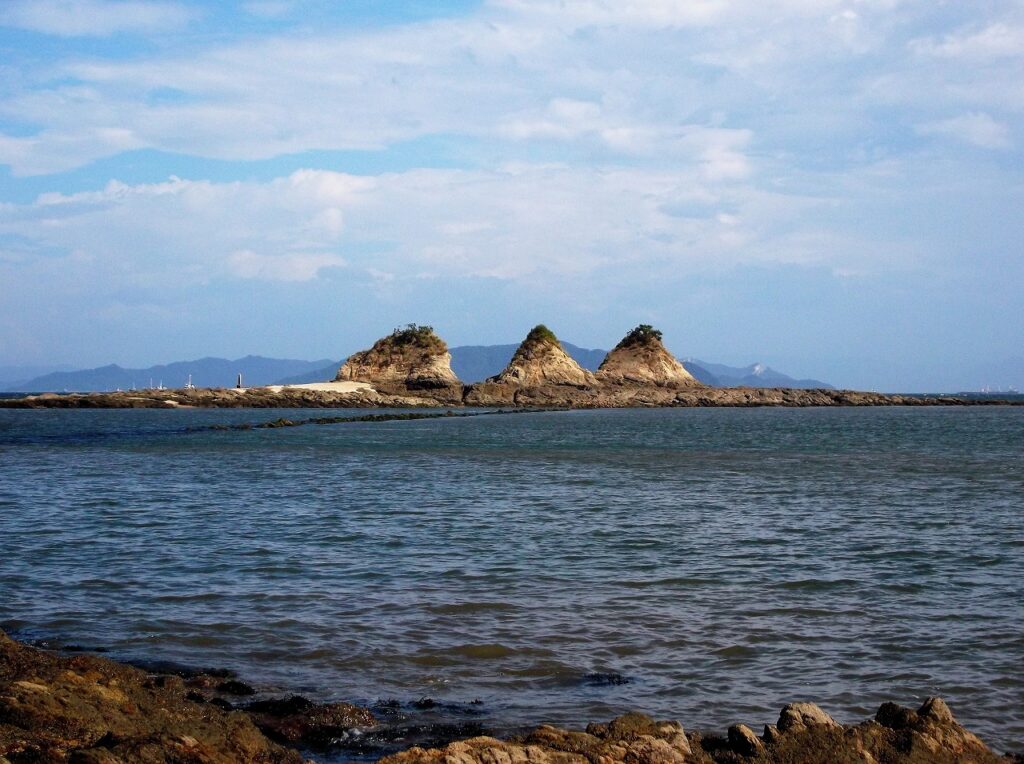 波が花崗岩を浸食して見事な景勝美を演出している。日の出の時間帯は一面が朱に染まり、夢のように美しいそうだ。この日は大潮の干潮で、三つの山が大きな一つの島となっている。こちら寄島と完全に地続きにはならないが、元気のいい子どもたちが浅瀬を歩いて三郎島に渡っていた。