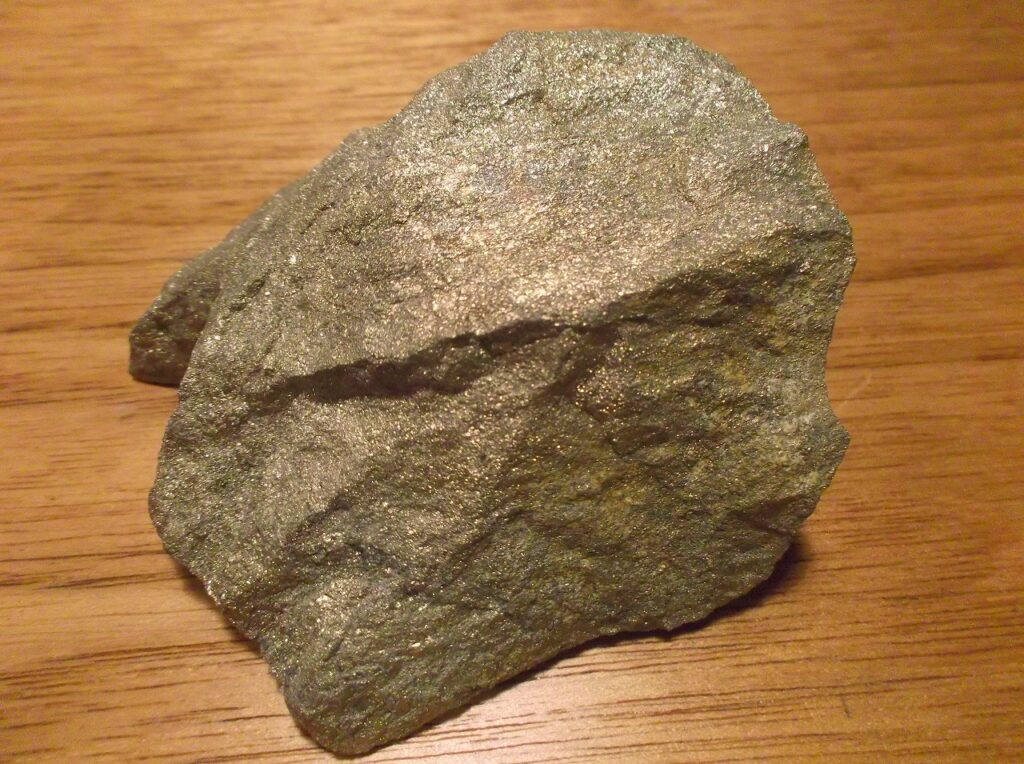 これは柵原鉱山産の「黄鉄鉱」と呼ばれる硫化鉄鉱である。化学式はFeS2、鉄と硫黄から成る。その美しさから「愚者の黄金」とも呼ばれているそうだ。