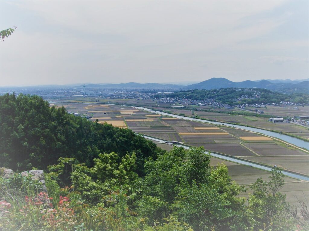 砥石城から西を向いている。千町川は画面左へ流れ吉井川に注ぐ。正面の形の良い山は備前富士の芥子(けしご)山で、その左に操山山塊があり、その向こうに見えないが岡山城がある。このような風景が気宇壮大な人物を育てたのだろうか。
