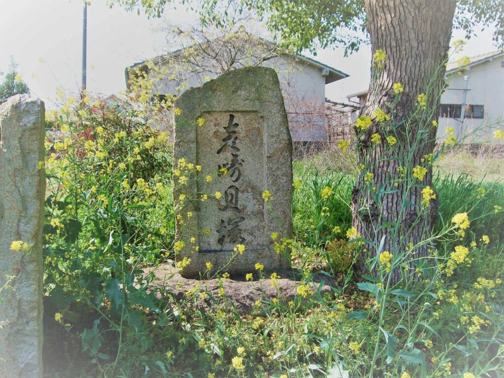 石碑は昭和40年夏に地主の酒造家によって建てられた。戦後間もなくの頃、樽干場を拡幅するための掘削で厚い貝層が見つかったことから、本格的な発掘調査が始まった。酒屋が醸していたのは「栄松」という銘柄の美味い酒だったようだが、今はもうない。