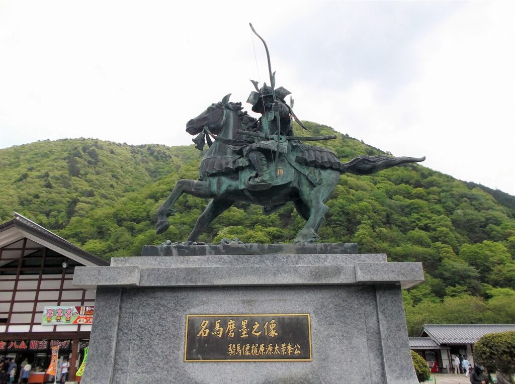 迫力ある騎馬像なら、湊川公園皇居外苑の楠木正成像が有名だ。人馬一体の姿ではあるが、主役はあくまでも人だ。ところが磨墨像では人は脇役、とはいえ、こちらも武者姿を見事に活写している。原型制作は高岡銅器の石黒孫七である。この武者は誰なのか。説明板を読んでみよう。