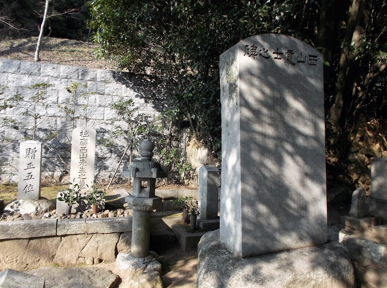 お墓は先生の人柄そのままに慎ましいものだが、手前の顕彰碑の大きさは先生の功績を表している。「西山処士之碑」とあるが、処士とは仕官しない在野の人を指す。この碑は柴野栗山撰文、頼春水題額、頼杏坪書である。栗山は寛政異学の禁を進言した儒者、春水は頼山陽の父、杏坪は山陽の叔父という有名な儒者三人が関わっているので「三絶の碑」と呼ばれている。