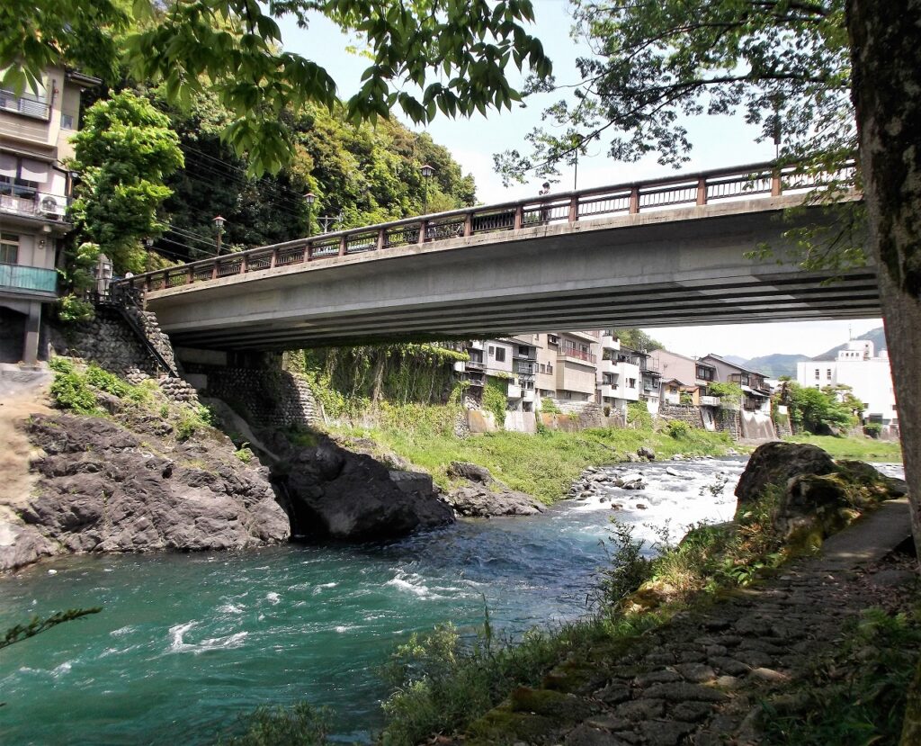 写真は春なので誰も遊んでいないが、夏になると子どもたちが川遊びをする。泳いだり魚を獲ったり、いろいろな遊びをするが、中でも難易度が高いのが飛び込みだ。低い岩から練習して、最後は新橋から飛び込む。約12mの高さがあり、同じ眺めでも下からと上からとでは全く違って見える。