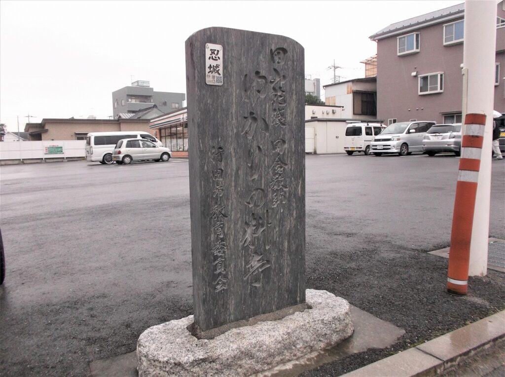 行田市行田に「田山花袋田舎教師ゆかりの料亭」と刻まれた石碑が立つ。小説に登場する料亭「魚七」が、ここにあったという。