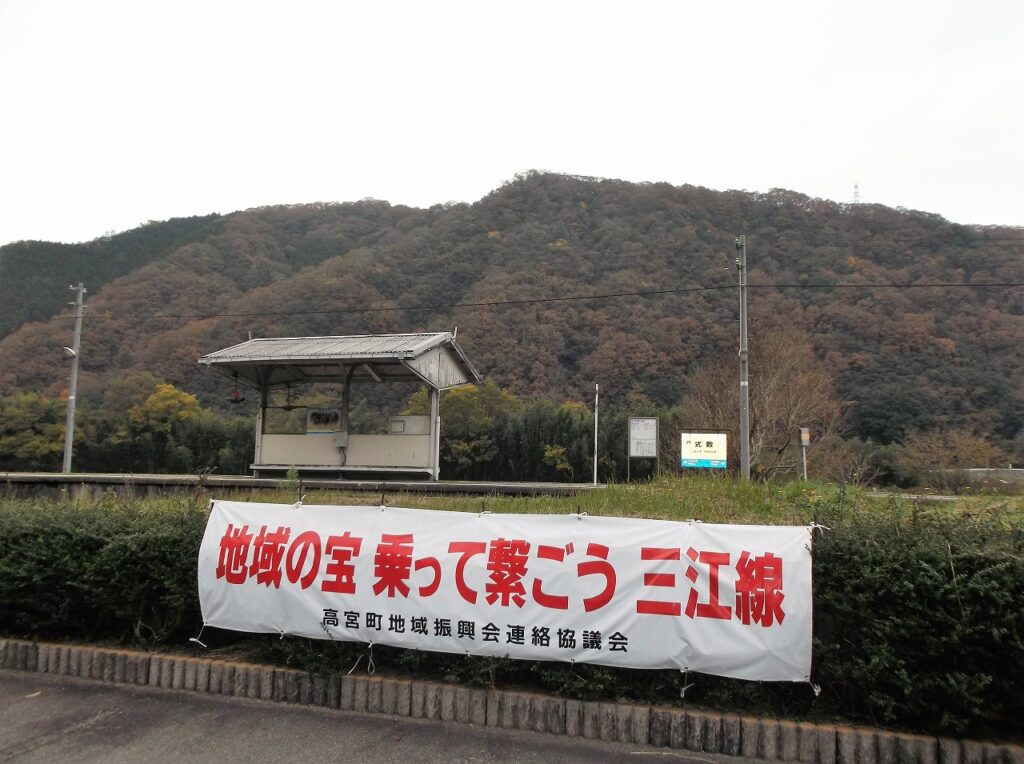 川毛踏切から少し上り方面(江津方面)に「式敷(しきじき)駅」がある。いや、あった。今年3月末をもって三江線は廃止されたのである。横断幕のすぐ向こうに貨物ホームがあり、物流の拠点にと期待されたようだが、使われることはなかったらしい。