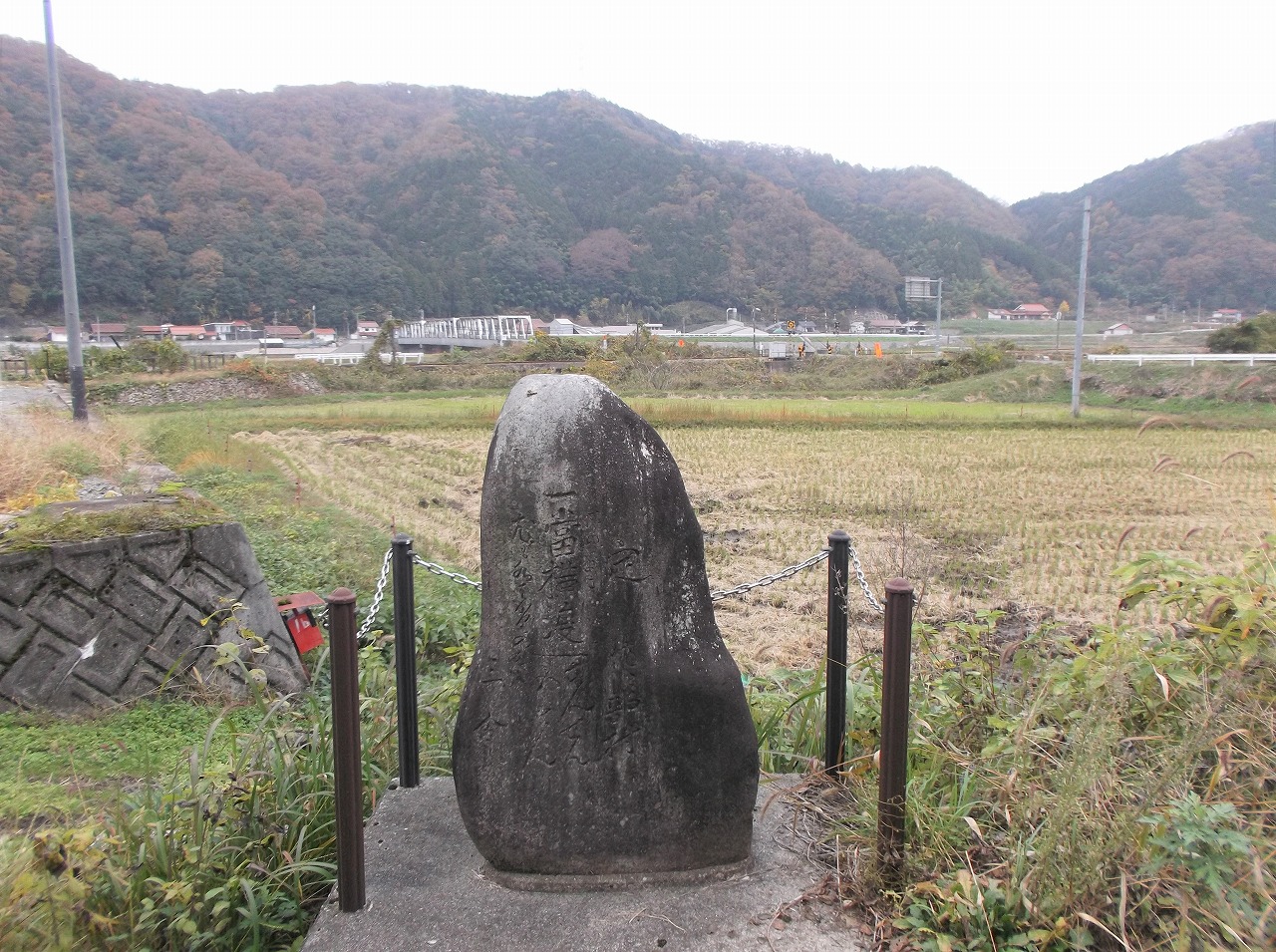 碑の向こうには、JR三江線の川毛踏切、江の川に架かる式敷大橋が見える。ここには、江の川の舟運がさかんだった時代に、船着き場があったそうだ。橋が架かったのは昭和28年。それまでは渡し舟が運航していた。