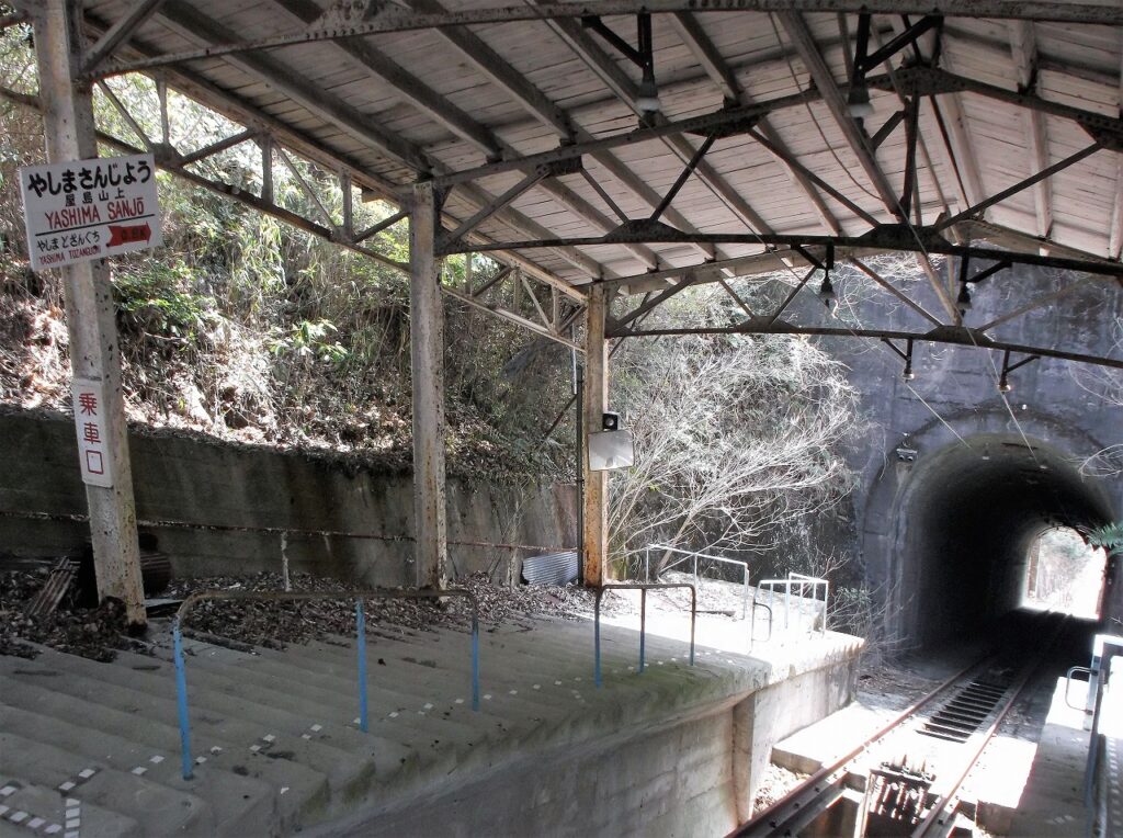 我が国の交通史を物語るかのような屋島ケーブルのあゆみである。廃線跡は将来、遊歩道として活用されるとも聞く。ケーブルもよし、自動車もよし。自分の力で登るもまた、よしだろう。遊歩道となった急斜面をゆっくり登り、山上近くのトンネルをくぐれば旧駅舎に到達。さらに屋島寺に参拝して帰途につけば、達成感のある屋島観光になりそうだ。