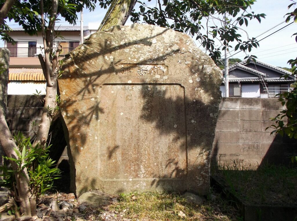 地震は(1860)11月5日発生マグニチュード8.4数丈におよぶ、大津波となり房総より九州に至る海岸を襲う橋本亀吉翁の記録には「志和岐では津波の高さ2丈余り家屋6件流出」とある、この碑は当時の模様を刻した物で「大地震の節は必ず押し来るべし、その期におよぶも油断これなきよう、この碑に刻み永く子孫に伝えおく」記されている。