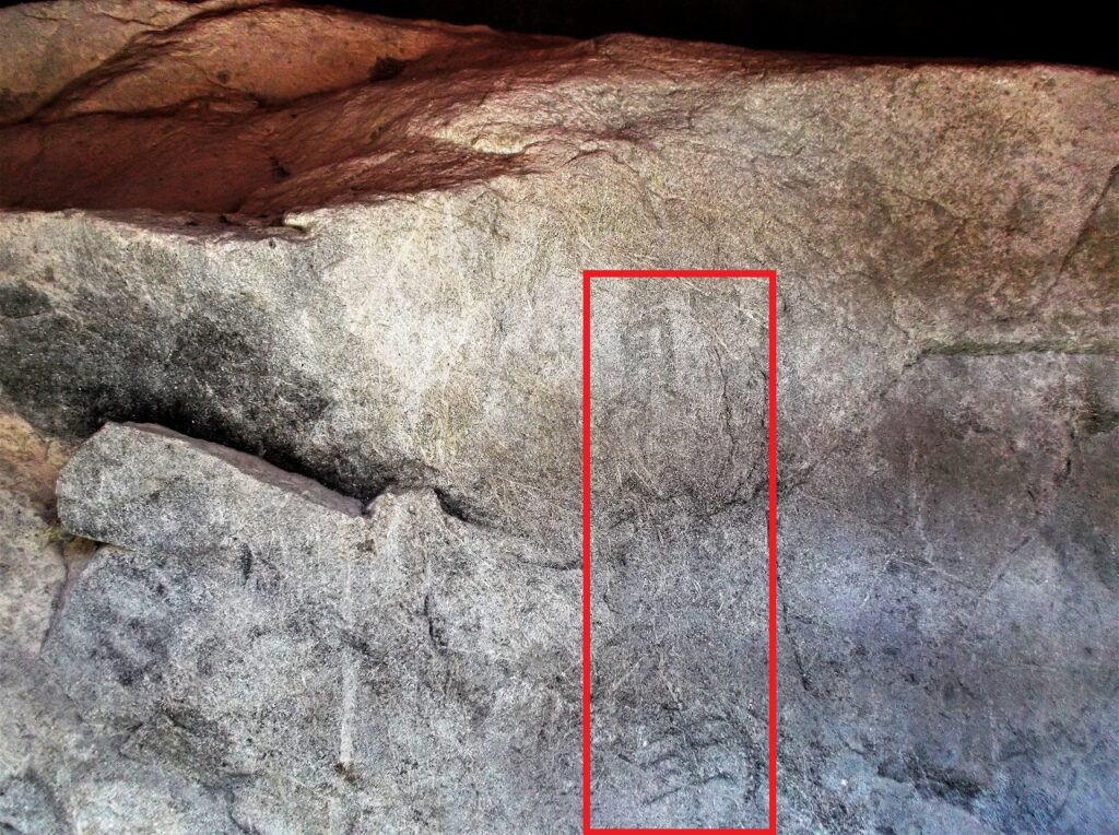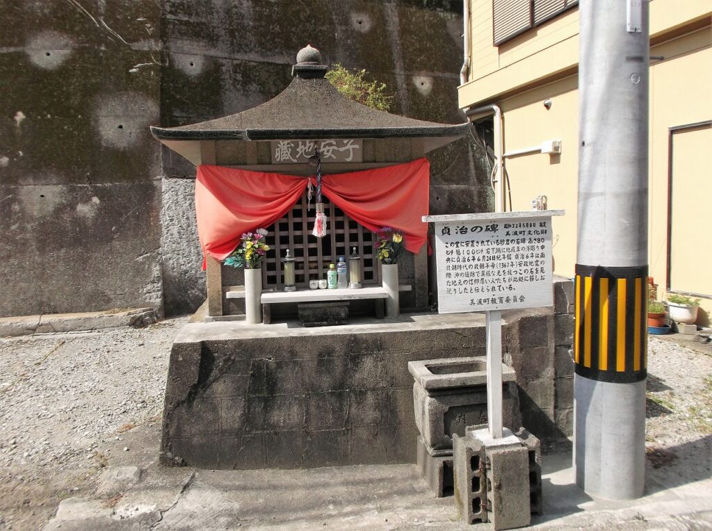 この堂に安置されている砂岩の石碑高さ80センチ幅100センチ右下隅に地蔵尊の浮彫り中央に貞治6年6月24日紀年銘貞治6年は南北朝時代の北朝年号(1367)安政地震の際沖の堤防で異様な光を放つこの石を見た地元の信仰厚い人たちが此処に移しお祀りしたと伝えられている。