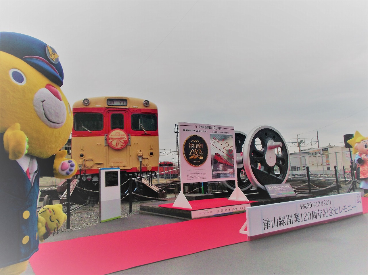 津山市大谷の津山まなびの鉄道館で「津山線開業120年記念セレモニー」が開かれた。写真には「くまなく」と「たびにゃん」も写っている。
