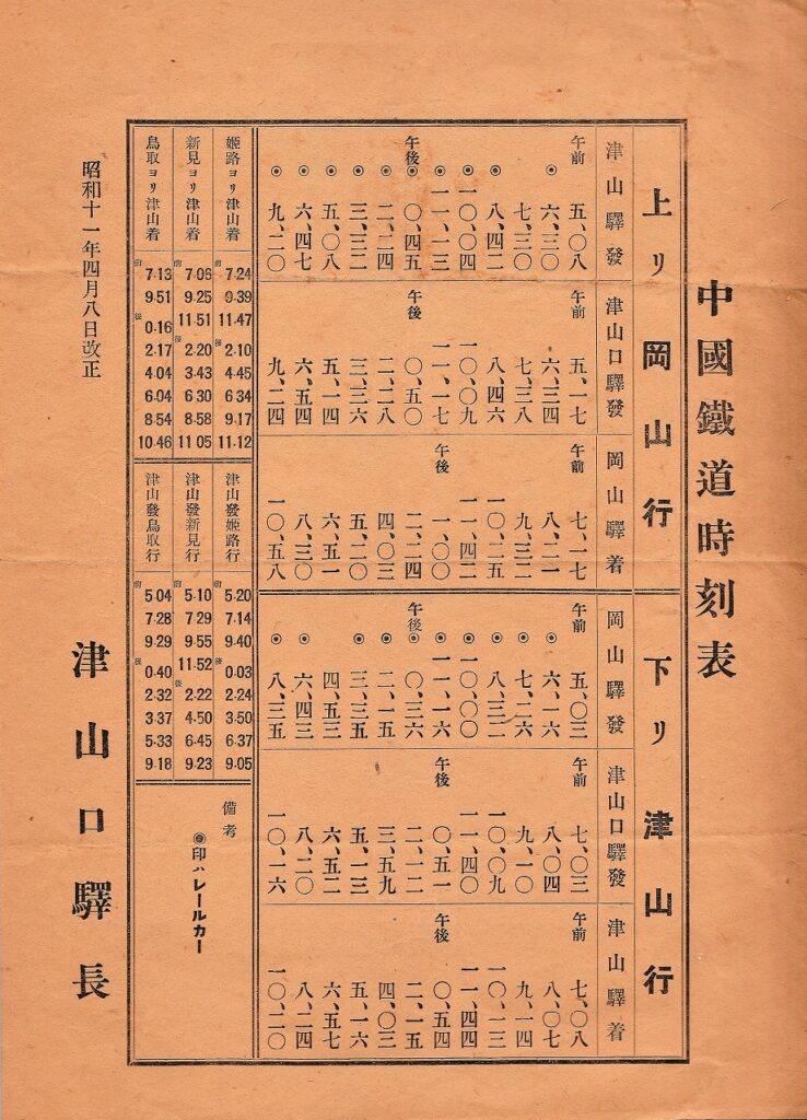 昭和11年(1936)当時の津山口駅時刻表を見よう。