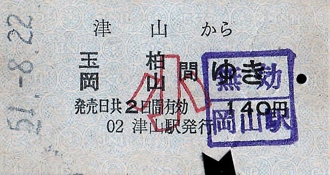 これは津山駅発行の硬券式小児用乗車券。当時の大人運賃は290円だった。現在は1140円もする。右のほうにある小さな穴は、綴るために開けられているらしい。鋏痕は乗車した津山駅のM字型で、降車した岡山駅の無効印の下に車内改札の鋏痕「に」のエンボスがある。