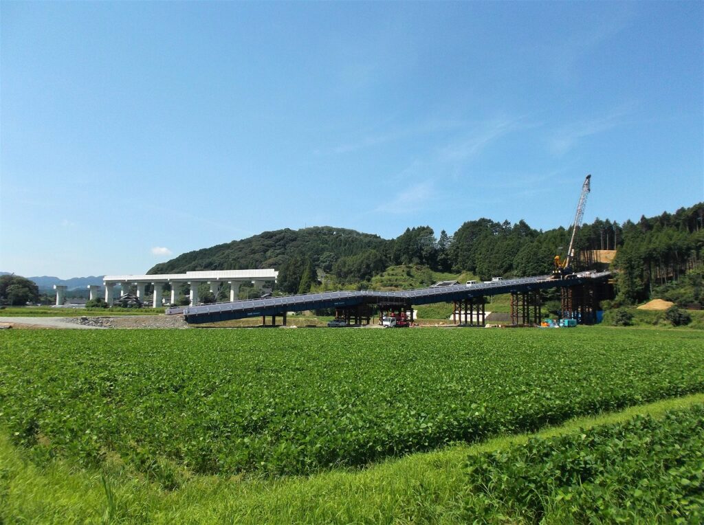 道路の建設工事ならよく見かけるが、新幹線の工事はなかなか見る機会がない。畑の中には巨大なスロープが設置されていた。