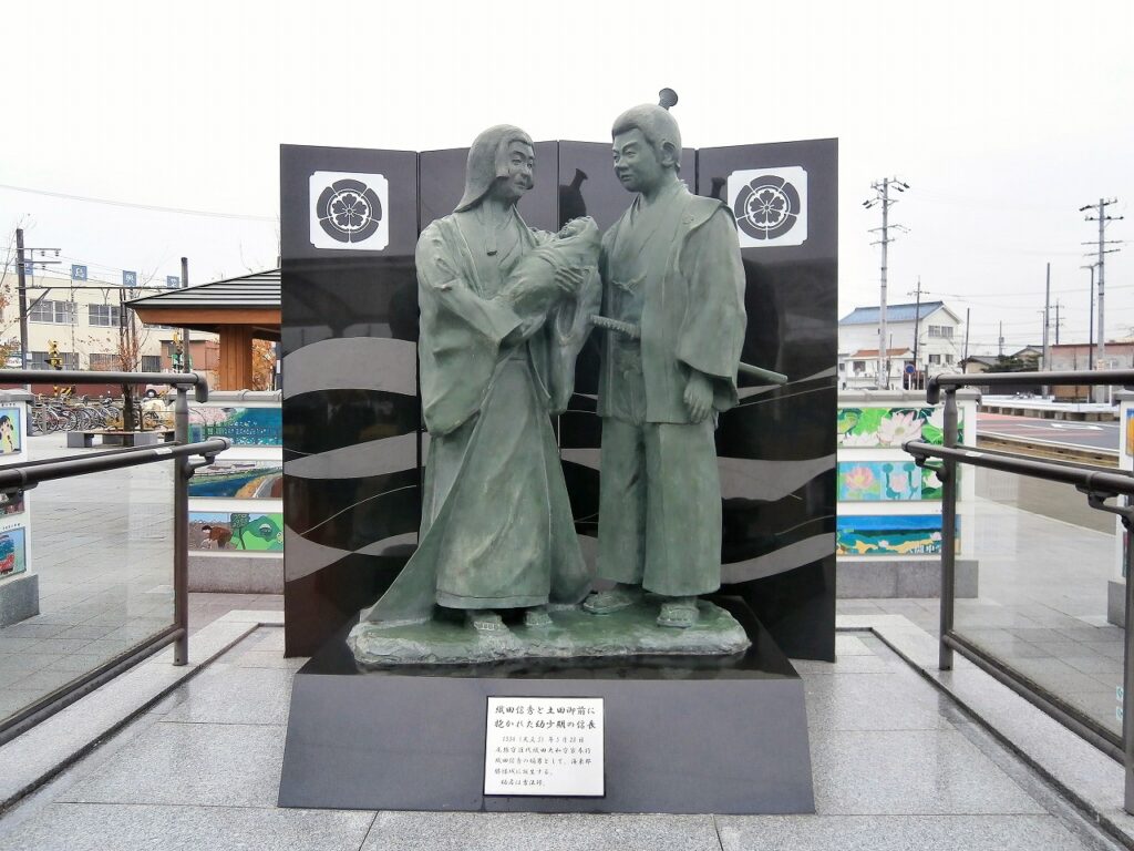 愛西市勝幡(しょばた)町の名鉄勝幡駅前に「織田信秀と土田御前に抱かれた幼少期の信長」という像がある。