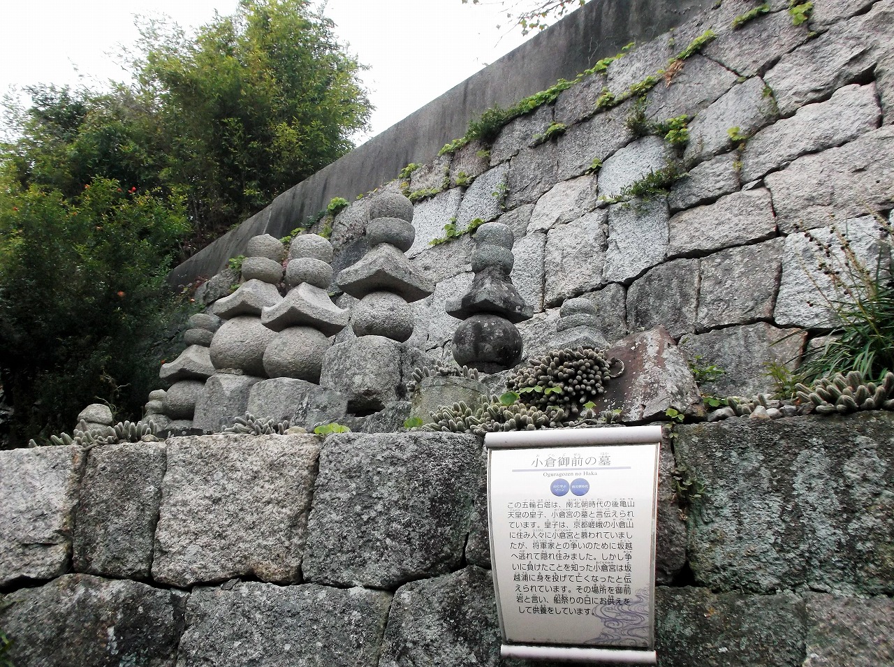 この五輪石塔は、南北朝時代の後亀山天皇の皇子、小倉宮の墓と言伝えられています。皇子は、京都嵯峨の小倉山に住み人々に小倉宮と慕われていましたが、将軍家との争いのために坂越(さこし)へ逃れて隠れ住みました。しかし争いに負けたことを知った小倉宮は坂越浦に身を投げて亡くなったと伝えられています。その場所を御前岩と言い、船祭りの日にお供えをして供養をしています。
