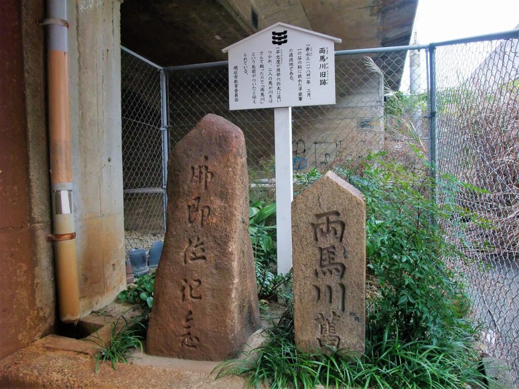 明石市大蔵天神町のJR神戸線の下に「両馬川(りょうまがわ)旧跡」がある。