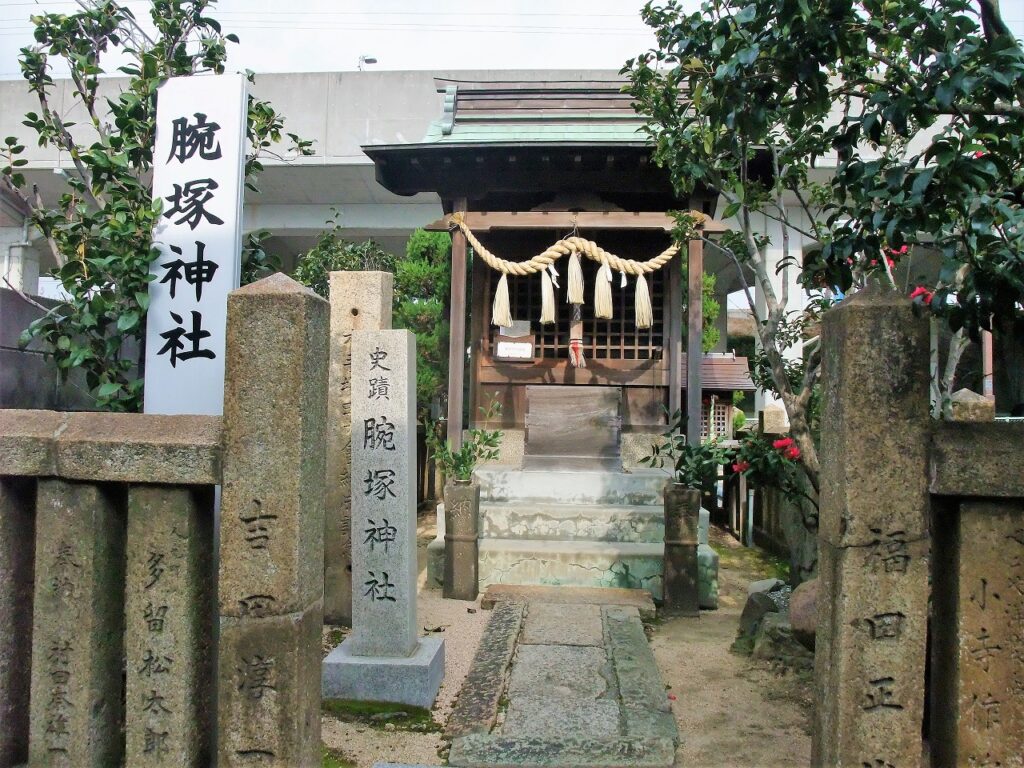 明石市天文町一丁目に「腕塚神社」が鎮座している。もとは塚だったが鉄道敷設の際に取り壊され、神社として祀った。