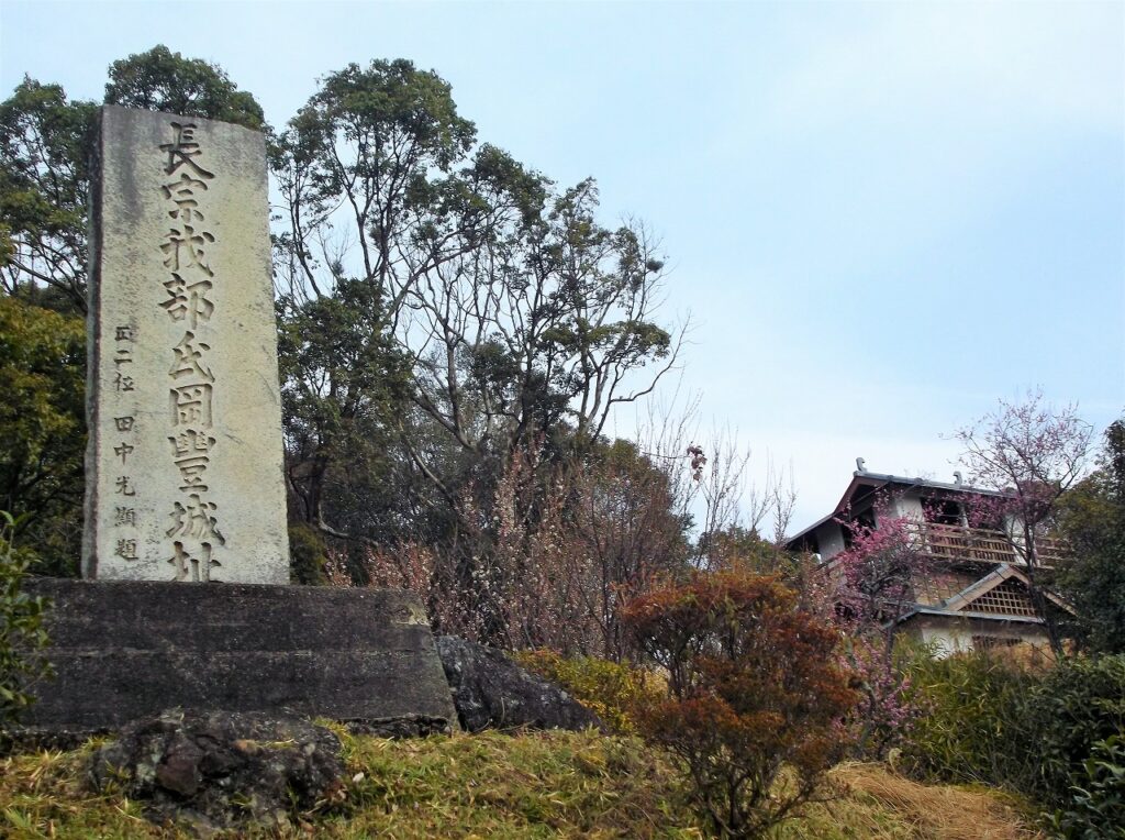 南国市岡豊町八幡(おこうちょうやはた)に「長宗我部氏岡豊城址」の石碑がある。揮毫は土佐藩出身の正二位田中光顕である。維新で活躍し、明治期に内閣書記官長や宮内大臣などの要職を歴任した。昭和九年に建てられた。