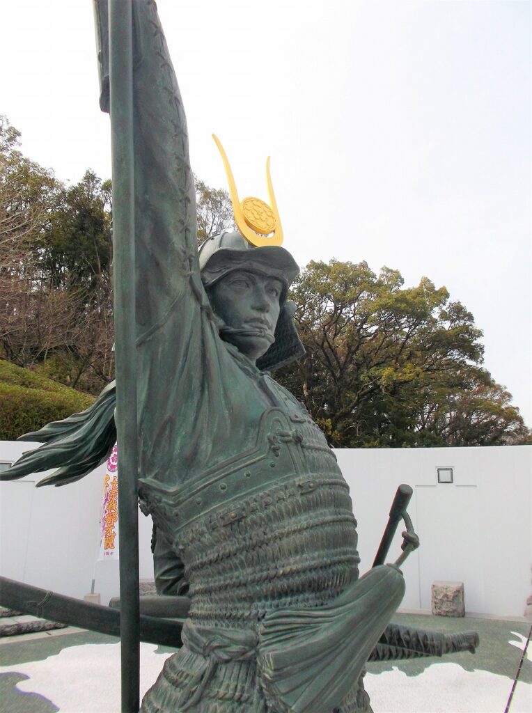高知県立歴史民俗資料館のエントランス前に「長宗我部元親飛翔之像」がある。有名な肖像画とはまったく異なる。かろうじて十二間突盔形兜(じゅうにけんとっぱいなりかぶと)で元親だと分かる。初陣で着用していたという兜だ。手にしているのは約3.7mの長槍で、同じく初陣では槍で奮戦したと伝えられている。