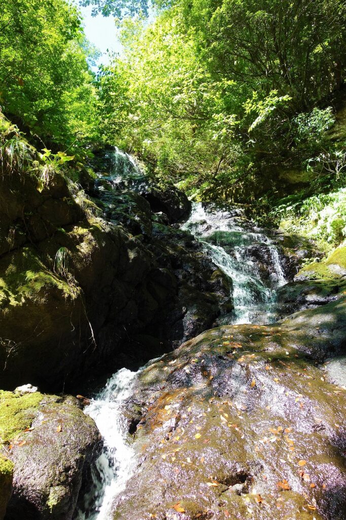 道路わきの駐車スペースに説明板はあれど、木々が生い茂り滝はまったく見えない。川へ降りて石伝いに対岸に渡ると、滝らしい流れが見えてくる。近付いて写真を撮ったのだが、これでも一部しか見えていないらしい。八頭町が設置する説明板を読んでみよう。