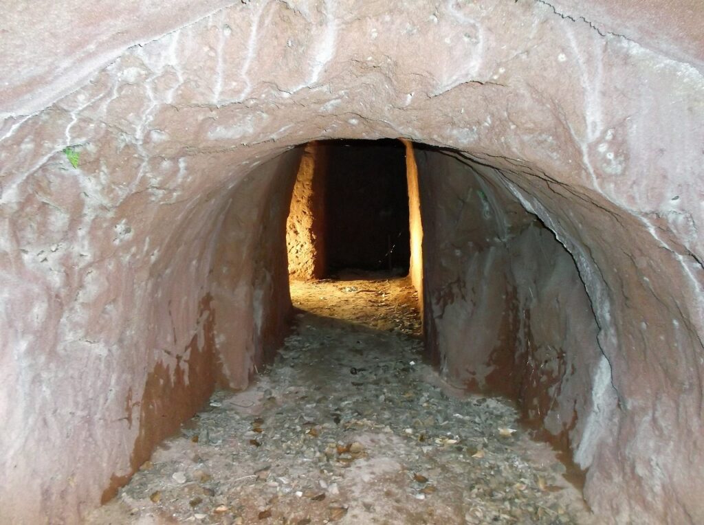 爆心地から北北東へ約700m、山里小学校の校舎裏(原爆投下当時は山里国民学校の運動場脇)の崖に残る防空ごう。