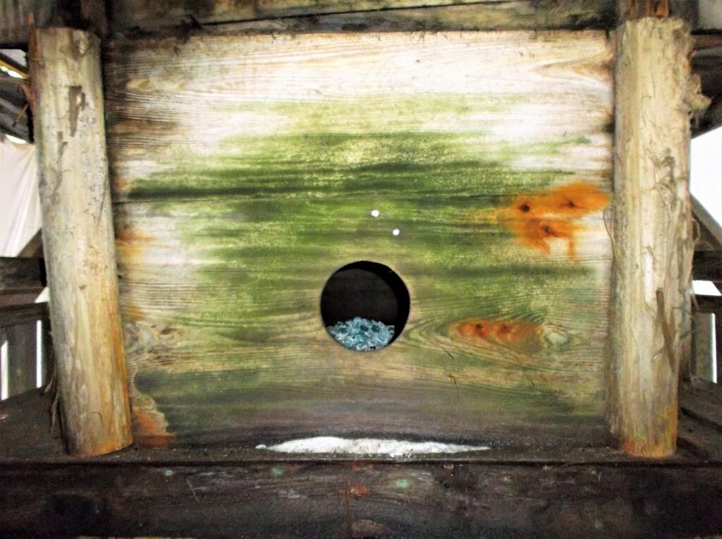 社殿の裏面には狼が通るという穴があけられている。白いものは塩で、狼様の好物だそうだ。籠も用意されており、袋に入ったままの塩が供えられていた。実際のオオカミに塩を好むという習性はないようだが、塩を与えると人に危害を加えないなどの伝説が全国に分布している。