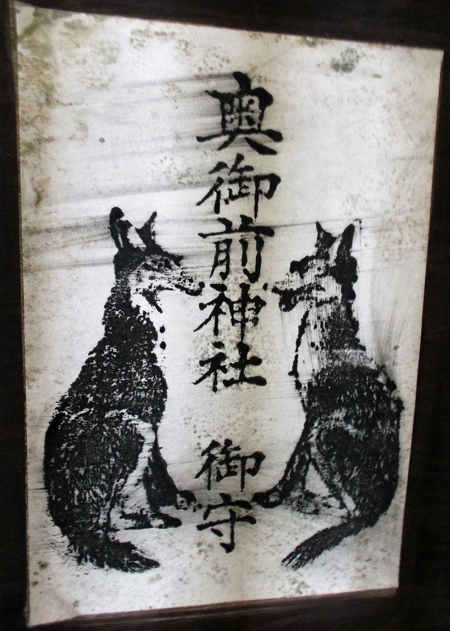 津山市桑上にある貴布禰(きぶね)神社の境内社に「奥御崎神社」がある。通称の「狼様」のほうが通りがよい。このお札は本社拝殿に掲げられていたものだ。