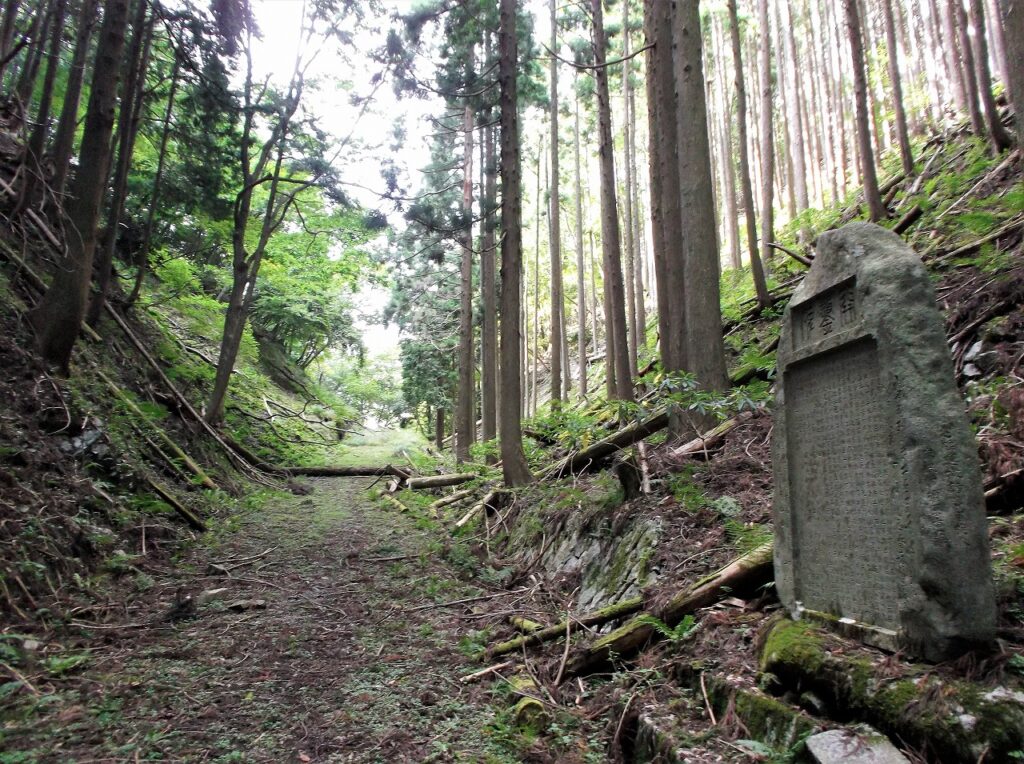 このトンネルの完成以前は、峠の頂を越える道だった。現在は「智頭往来志戸坂峠越」として国の史跡に指定されている。豪雨の影響で倒木があるが、峠道を登ってみよう。