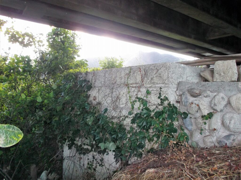 雨に当たらないためか、きれいな状態で橋台が残っている。頭上を行き交う車は、チンチン電車が同じルートを走っていたなんて、思いもよらぬことだろう。