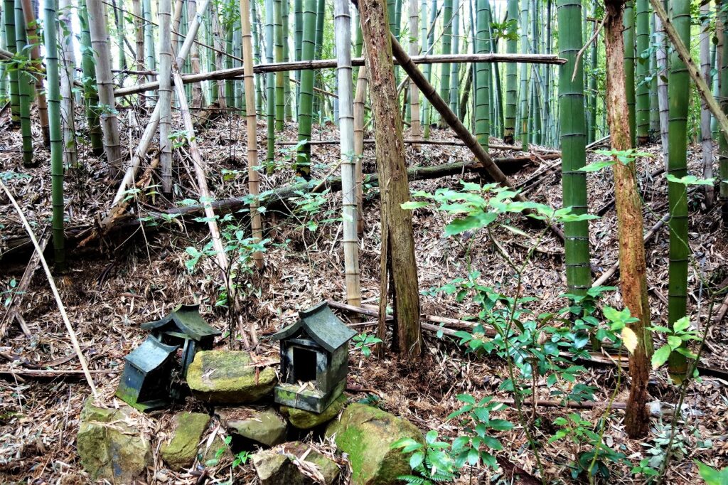 久米郡美咲町原田と西幸にかけて「稲荷山城跡」がある。写真は主郭の小祠と土塁である。