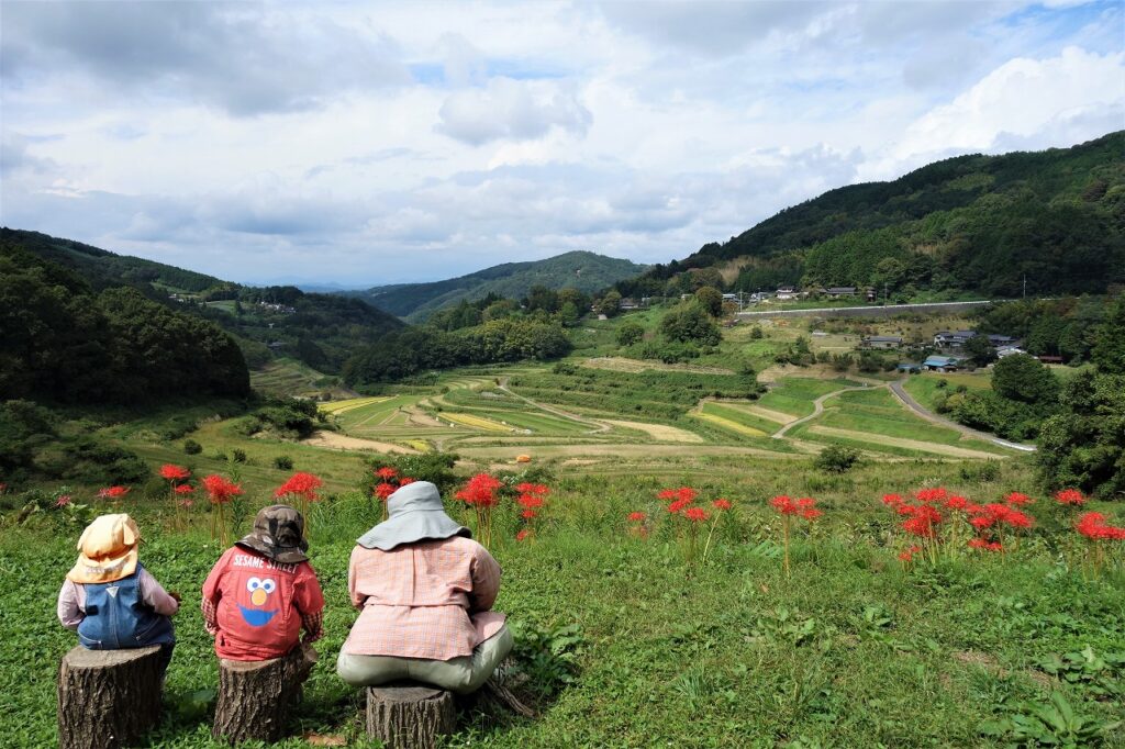 「その向こうには、細長い田んぼがだんだんになっとるじゃろう」「だんだん畑だね」「田んぼじゃからな、棚田というんじゃ」「ふーん、階段みたいに見えるなあ」