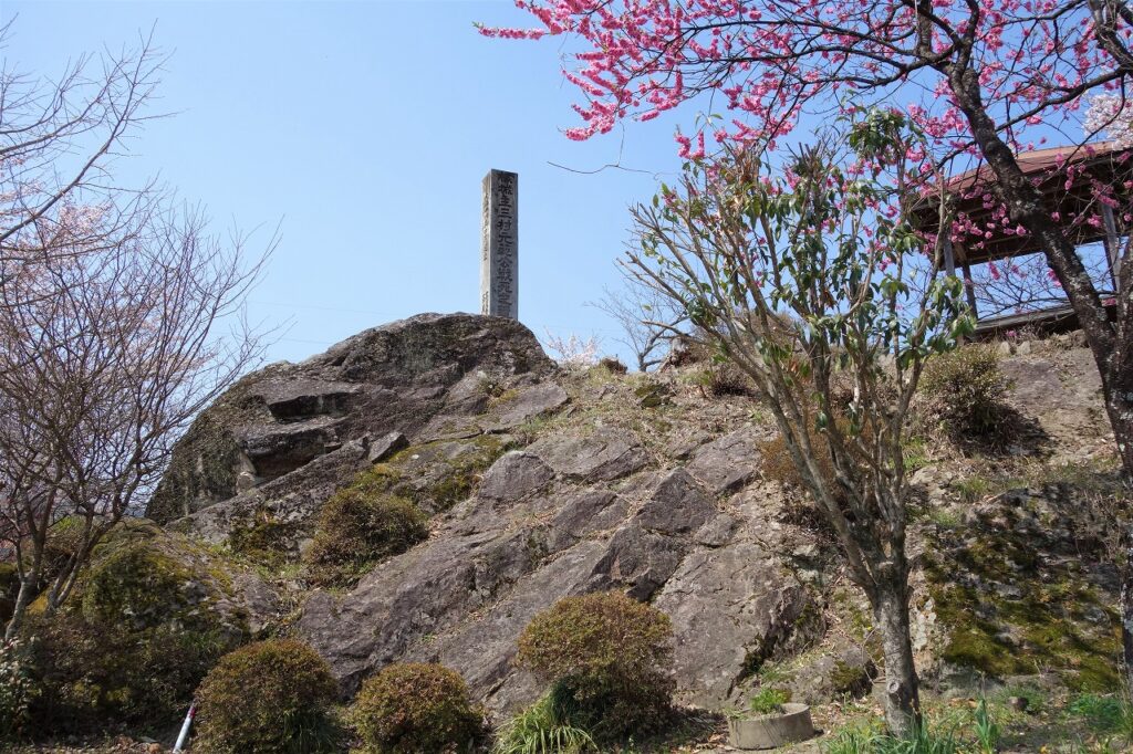 巨大な岩の上に「楪城主三村元範公戦死之遺蹟」と刻まれた石柱が立つ。説明板を読んでみよう。