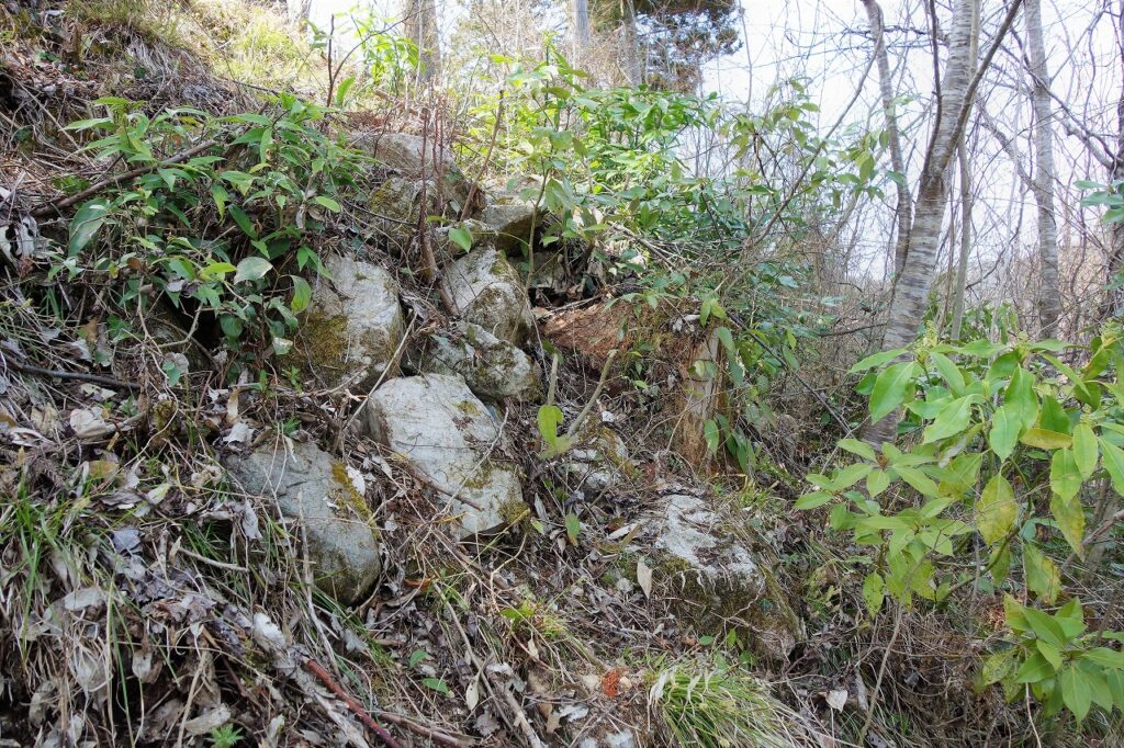 本丸は石積みで補強されている。この本丸と二の丸を結ぶ「帯曲輪(おびくるわ)」がすごい。長さが約80mもある。