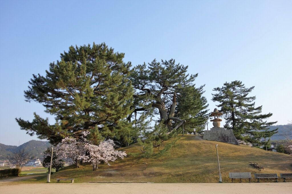 整然とした方墳だけならそれほど映えることはなかっただろうが、松の巨樹が時空の広がりを感じさせ桜が彩りを添えている。少し大きな石灯籠も違和感なく納まっている。もちろん築造当時の姿ではないが、美しさに磨きがかかったと言えるだろう。ところで、なぜ「角力取山」なのだろうか。説明板を読むこととしよう。