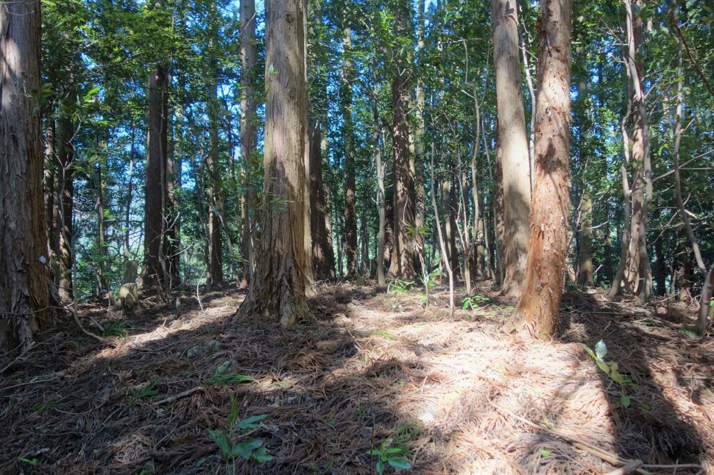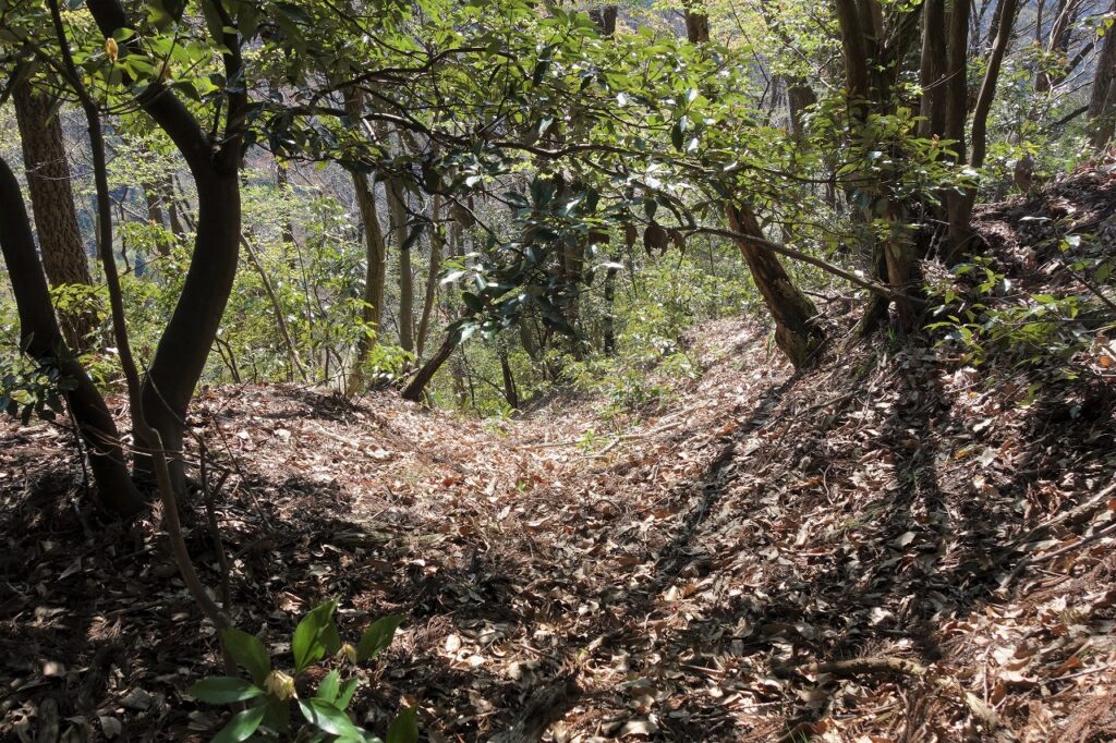 国道から急斜面を木の枝に取りつきながら少しずつ進む。本当に城跡なのか疑問を感じつつ登ると、山城の特徴である堀切と削平地があった。