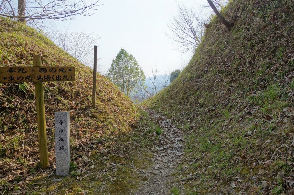 寺山城は主に三つの峰からなり、西から順に「西の丸」「本丸」「東の丸」と呼ばれており、また「東の丸」からさらに南東に派生する尾根上にも曲輪があり、「馬場」と呼ばれています。「西の丸」西端から「馬場」東端までは約650mを測り、城内には 曲輪・堀切・竪掘・横掘など、中世山城を構成する主要な防御施設が整っており、市内における山城としては珍しいものです。