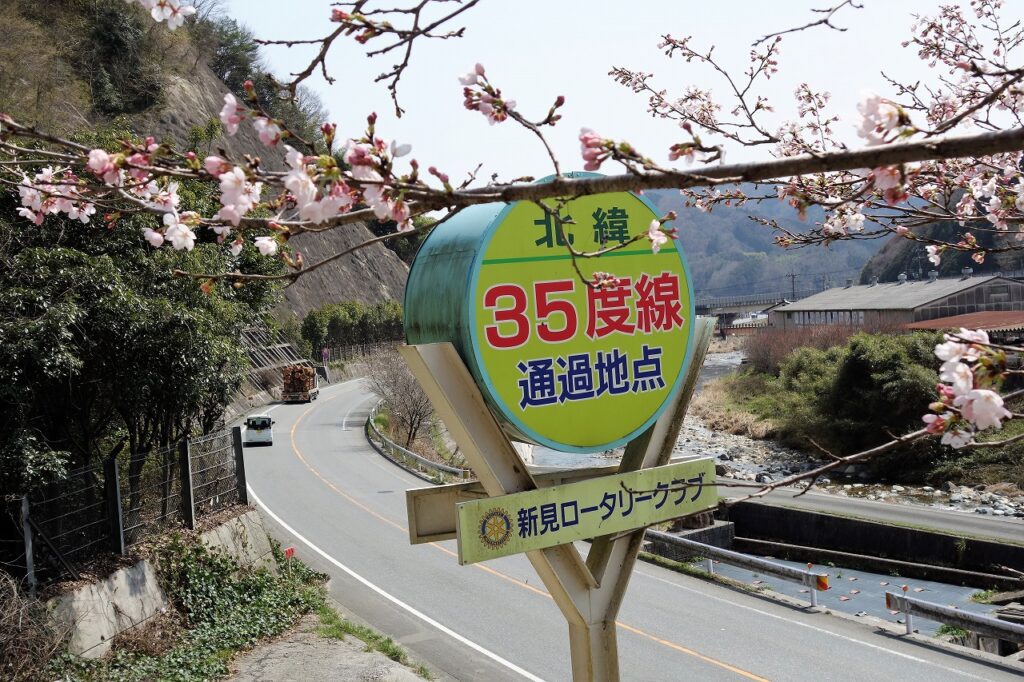 北緯35度は島根県江津市から日本に入り、千葉県南房総市で太平洋に抜けている。通過する地点は無限にあるのだが、所々に表示があるのでそれと知ることができる。