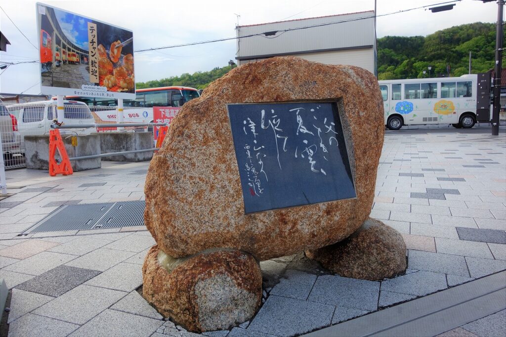 句碑を取材しているのに、うしろの「テッチャン、歓迎」が気になる。津山を代表する食文化はテッチャンことホルモン、そして、鉄ちゃんは扇形機関車庫へ向かうのだ。