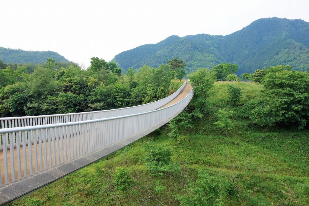 城峪城跡はもともと吉井川左岸の独立丘陵にあったのだが、ダム建設により周囲が水没したため、今では「浮島」と呼ばれている。地盤は固くフワフワしていない。浮遊感があるのはむしろ「浮島橋」のほうで、これぞ夢の浮橋かと思わせるような珍しい橋だ。橋を支えるケーブルが橋桁の中に通されているそうだ。