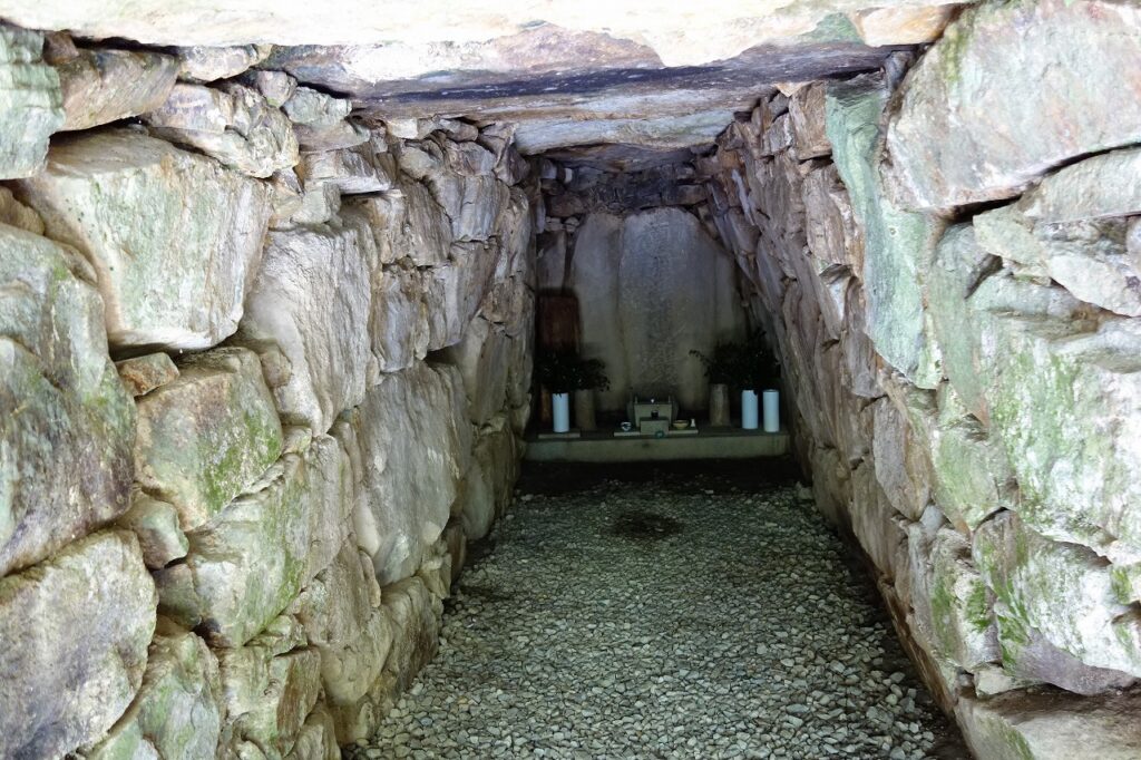 備前での寛文の法難は、藩主池田光政によって不受不施派への徹底的な弾圧が加えられた。備前佐伯本久寺住僧の竪住院日勢聖人は難を遁れて作州に潜入後、寛文九年(1669)二月に此の塚を断食終焉の地と定めて入篭せられた。奥壁に向かい読経唱題しつつ玄題を刻み、従う四人の比丘尼と共に入定される。