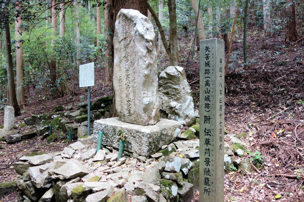 津山市加茂町山下に「矢筈城跡(高山城跡)附伝草苅景継墓所」がある。城跡とともに県の史跡である。