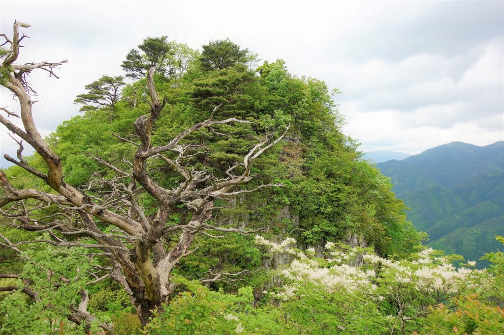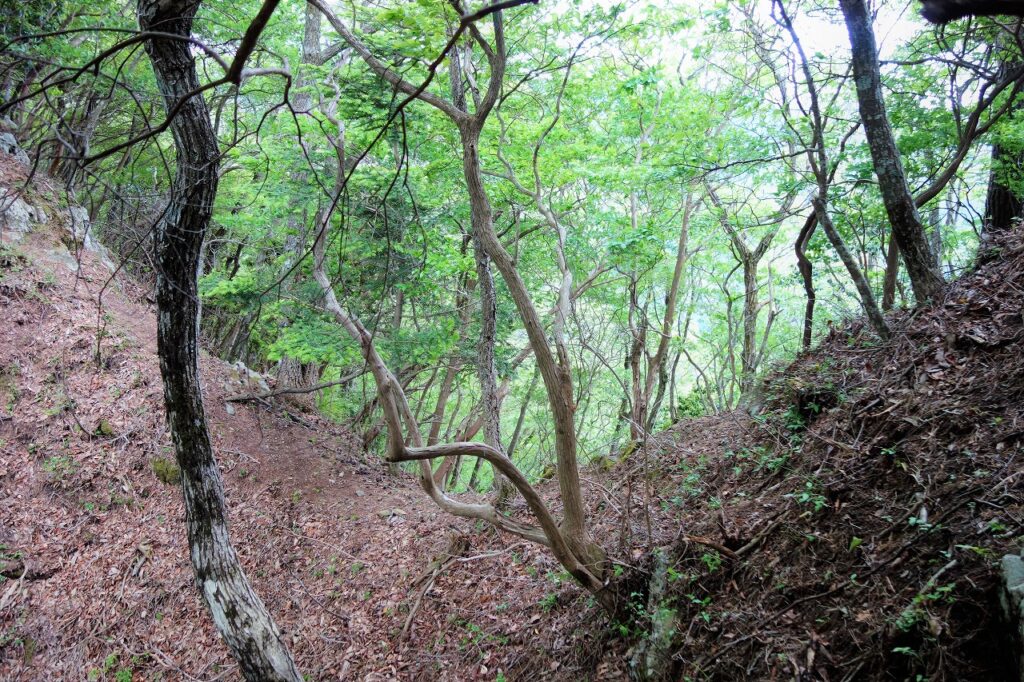 頂上には四等三角点「矢筈山」がある。本丸の「大筈」はそれほど広い場所ではない。建物は京都の清水寺のような懸造(かけづくり)だったという。大筈と小筈の間にはV字の谷があることは山容の由来となっている。灌木につかまりながら谷に下りてみよう。