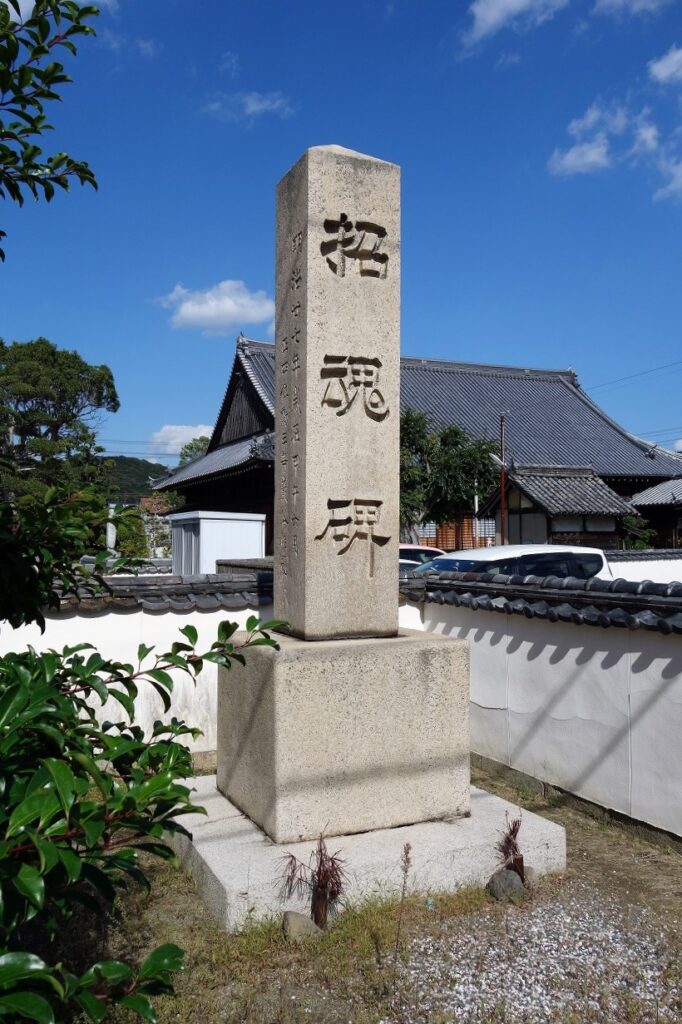 山門の西側に道路に面して立っている大きな招魂碑は、庚午事変(稲田騒動)で散った稲田家臣とその家族のために、明治二十七年に旧家臣たちが建てたものである。