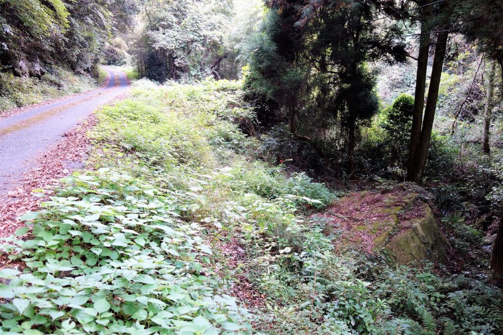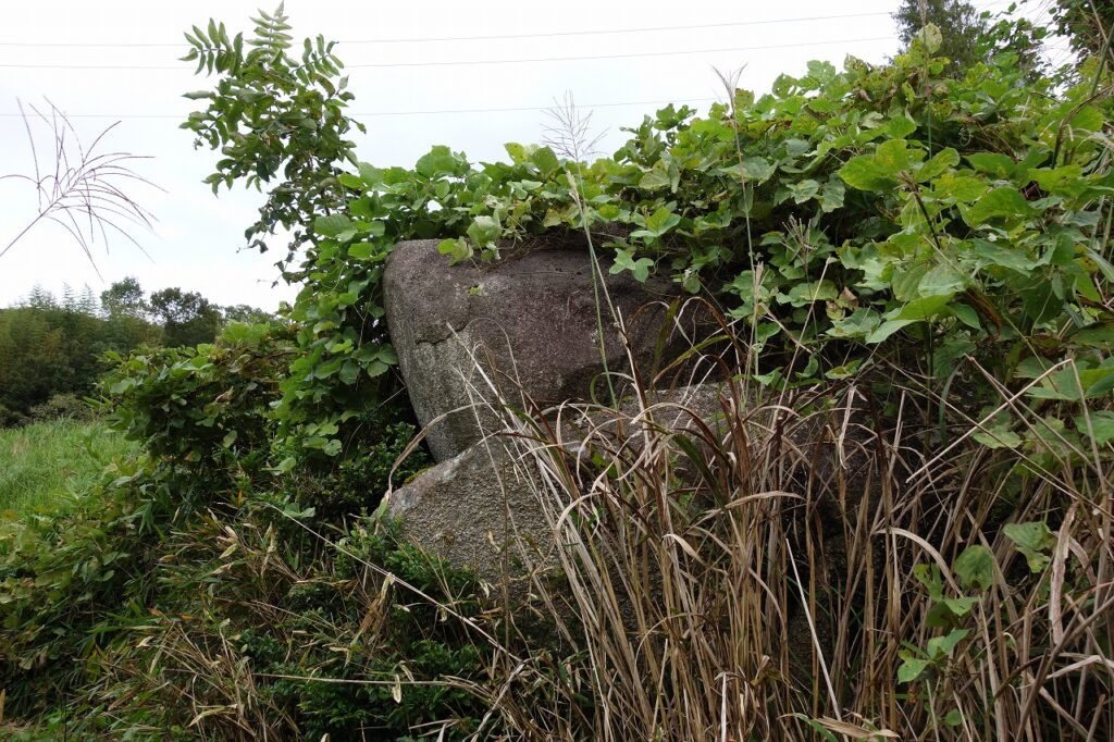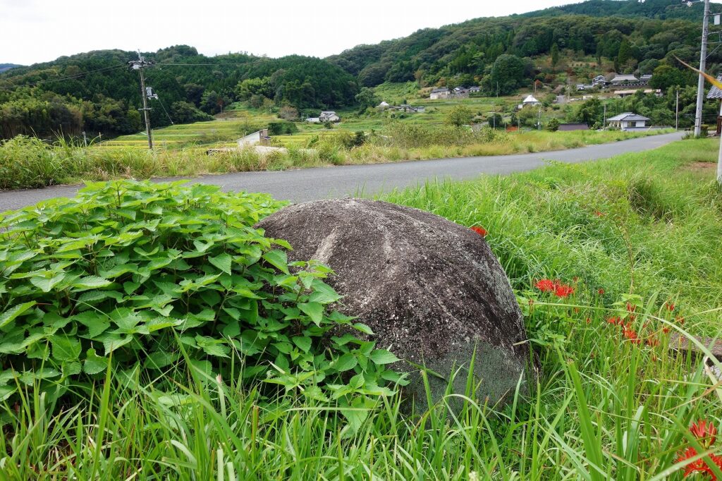 車道脇に「禾食石」の表示があるから入口は分かったが、竹藪の竹が倒れて行く手を阻み、岩に向かう細道に気付かず通り過ぎ、ちょっとしたアドベンチャーになってしまった。目印は散在する似たような石と平坦地で、そこから右手の斜面を登ればよい。「いねくい」という名称にもおどろおどろしさがある。どのような由来があるのか。『久米町史』下巻「伝説」では、次のように説明されている。